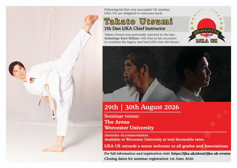 We are pleased to announce that Takato Utsumi Sensei, Chief Instructor of IJKA, will be visiting the United Kingdom to conduct a special IJKA seminar.